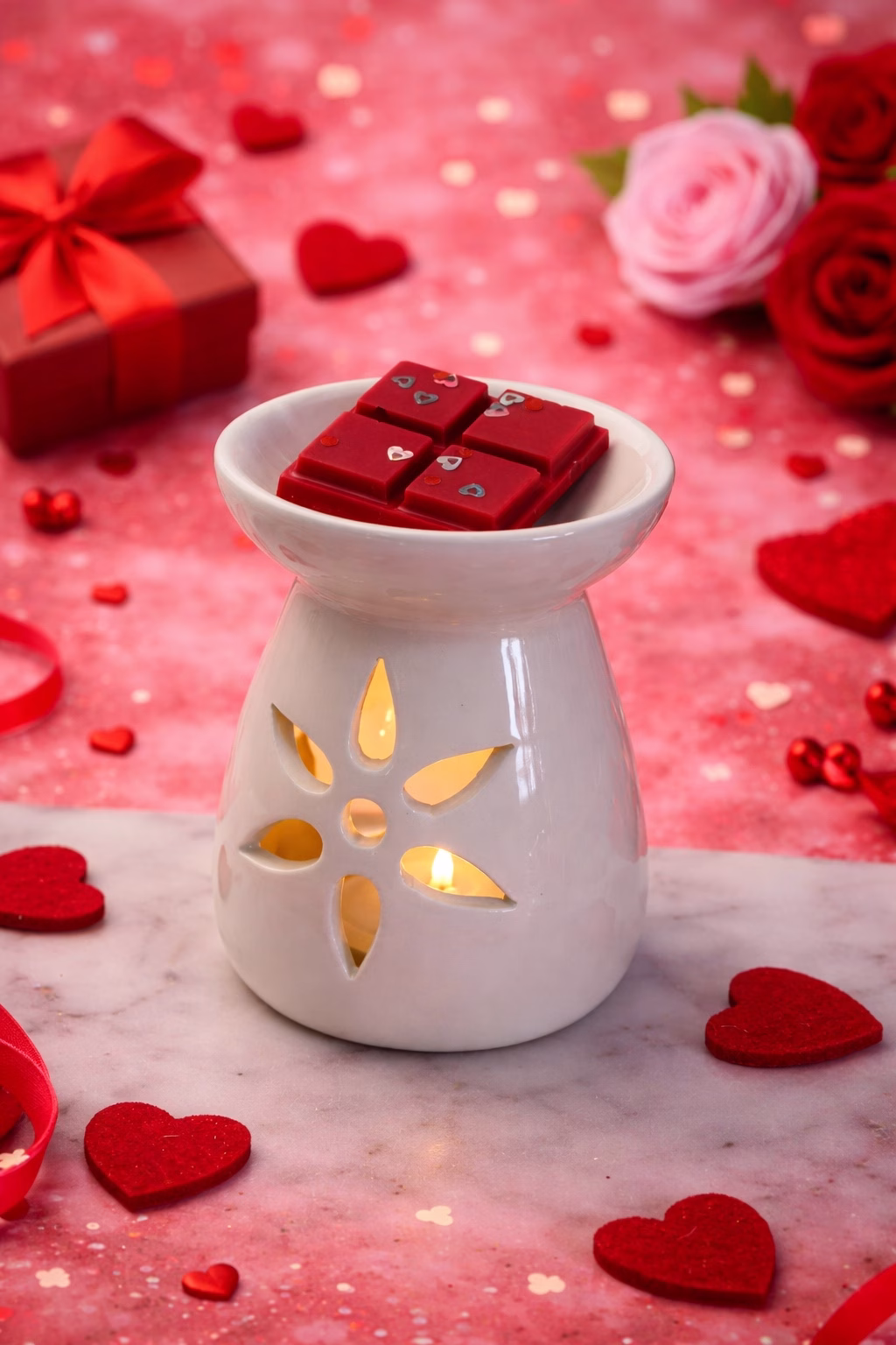Designul chocolate melts bar Valentine’s Lotis Ritual evocă ciocolată artizanală barocă (sec. XVII) prin textură luxoasă, reinterpretată minimalist: rupturile precise permit dozare controlată.