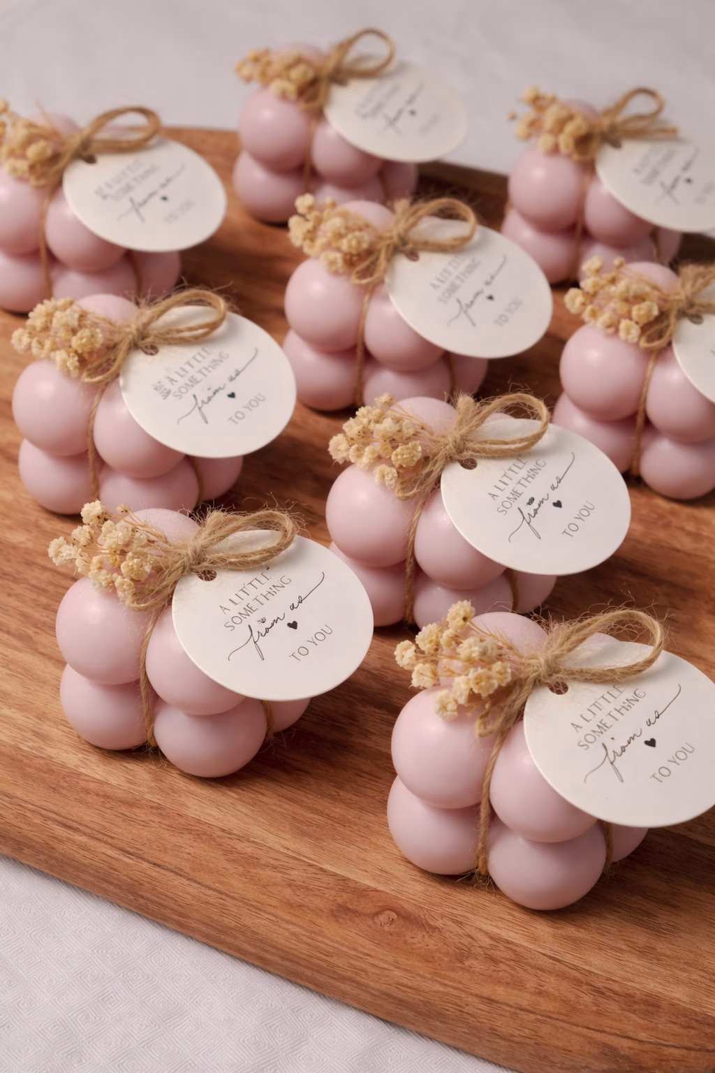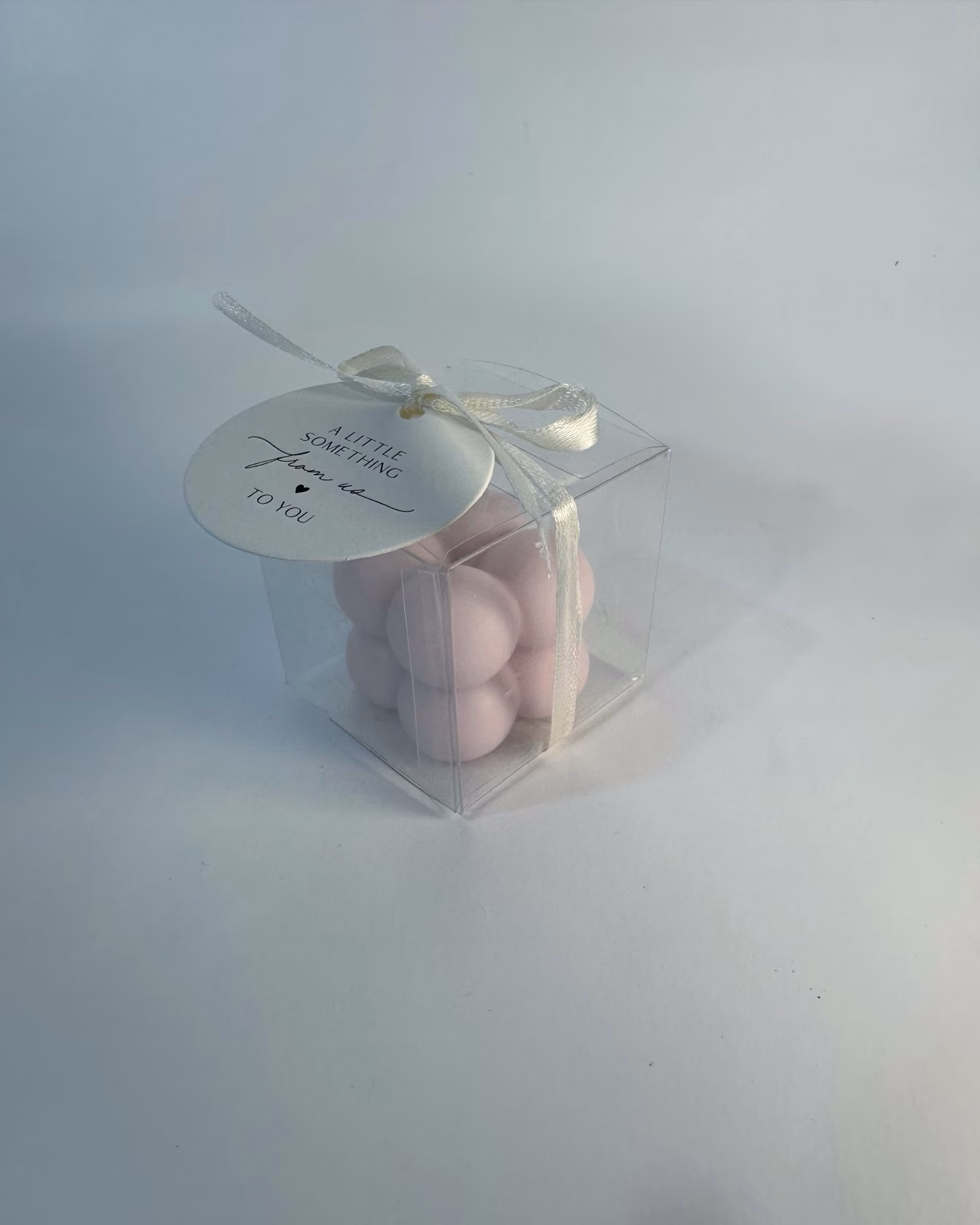 Bulele fine ambalate în cutie transparentă cu fundă satinată sau invelite in tulle, turnate manual din ceară de soia 100% naturală ecologică. Etichetă rotundă customizabilă sau sticker cu: nume cuplu/nume bebeluș, data nunții/botezului, culori personalizate (roz pastel, ivory, bleu ciel), mesaje unice („Am spus DA”, „Botezul nostru”, „Thank you”). Perfectă pentru invitați .