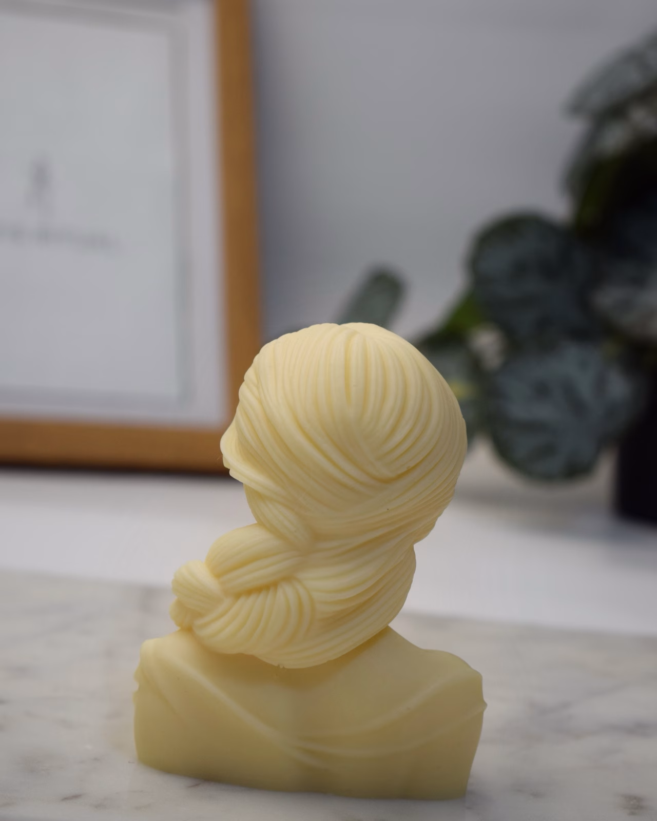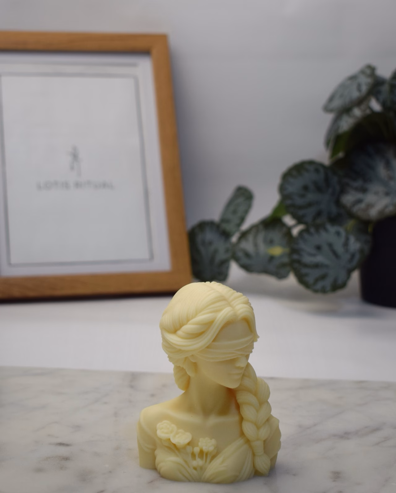 Descoperă această lumânare bust muse blindfold, lumânare sculpturală handmade din ceară de soia Lotis Ritual ce surprinde silueta feminină grațioasă: păr lung împletit, ochi acoperiți delicat și buchet de rozete pe umăr. Compactă (~123g), cu nuantă de ocru pastel, perfectă pentru ritualuri introspective lângă rame sau plante.