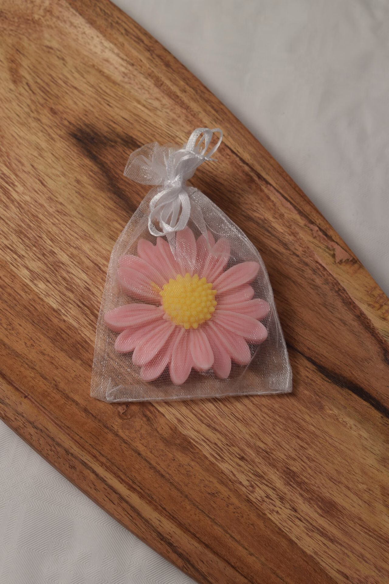 Lumânare turnată manual sub formă de floare detaliată, din ceară de soia 100% naturală, perfectă ca accent decorativ pe masă sau de păstrat ca suvenir. Poate fi oferită simplă pe suport, ambalată în cutie, săculeț organza sau îmbrăcată în tulle fin cu sclipici, pentru un efect festiv și elegant. Eticheta sau cardul atașat se pot personaliza cu numele cuplului ori al bebelușului, data evenimentului și un mesaj special de mulțumire.
