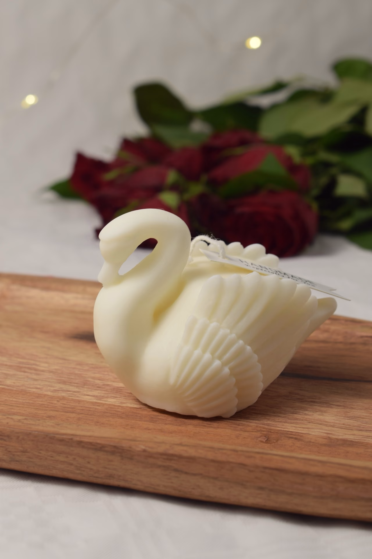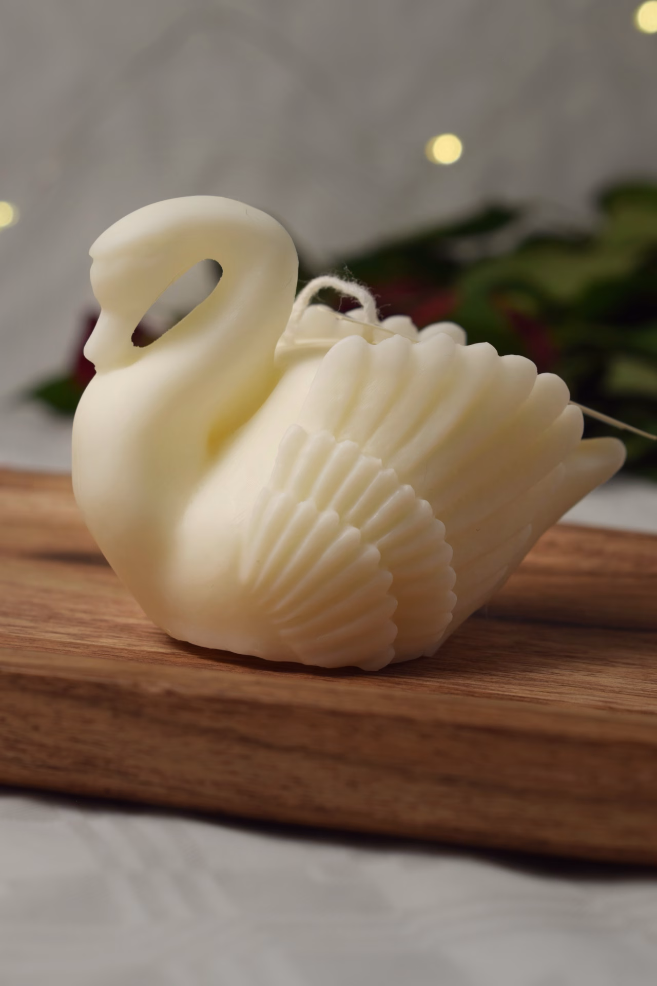 Lumânare turnată manual în formă de lebădă cu gât arcuit și aripi fine, din ceară de soia 100% naturală ecologică, în alb imaculat sau nuanțe sidefate (ivory, perlat). Etichetă customizabilă cu nume cuplu/bebeluș, data nunții/botezului, mesaje simbolice („Puritate eternă”, „Grace our day”, „Thank you”) și culori tematice.