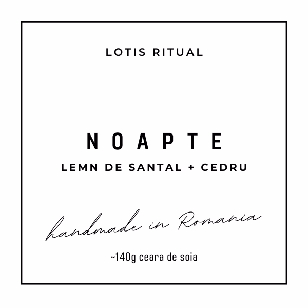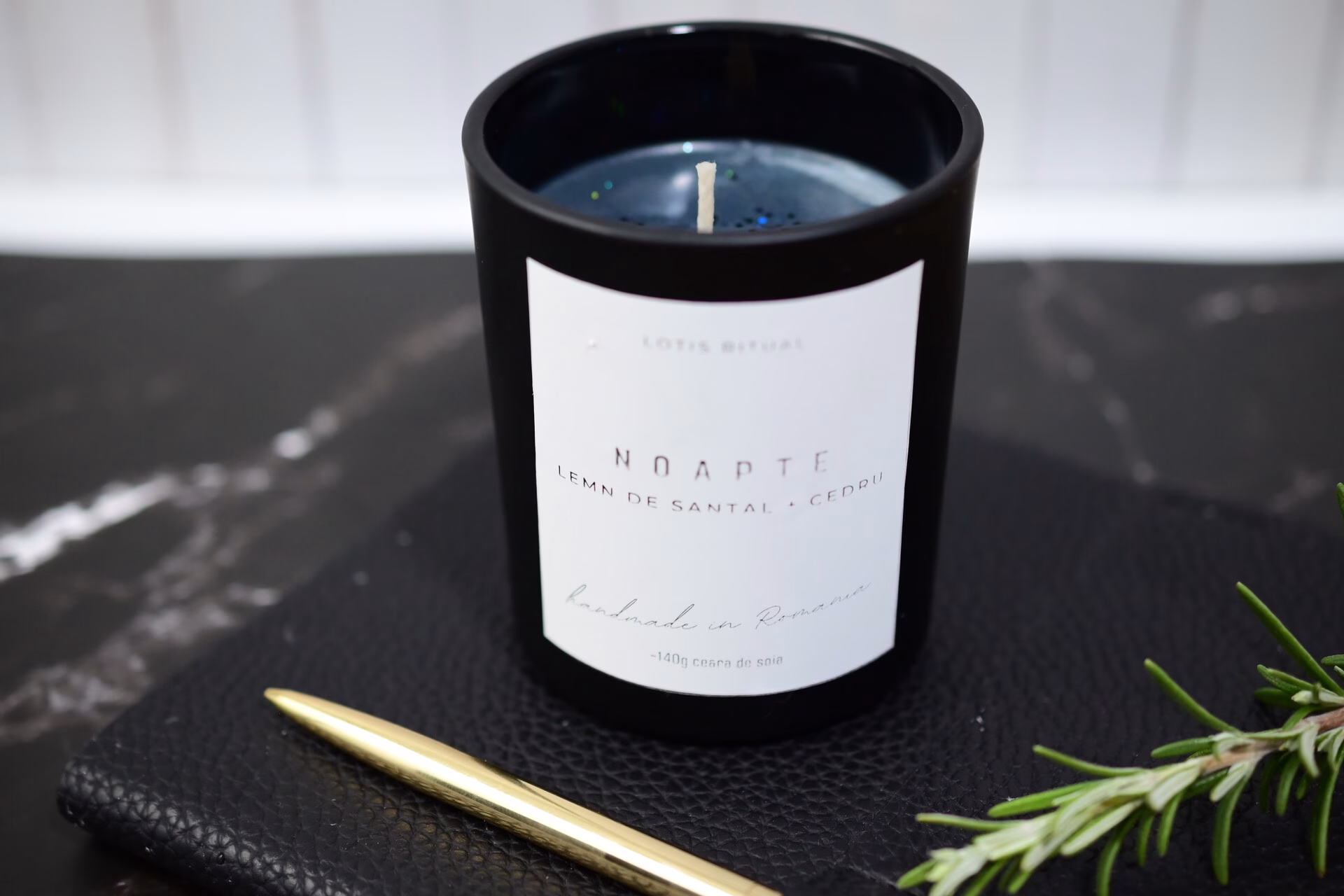 Descoperă aceasta lumânare parfumată handmade NOAPTE, alegere sofisticată Lotis Ritual pentru un decor enigmatic și modern, creată din 140g ceară de soia neagră premium în pahar negru mat elegant de 200ml, cu glitter cosmos ce captează lumina precum stele îndepărtate, inspirată de liniștea profundă a nopților înstelate ce invită la contemplare și relaxare interioară. Această lumânare parfumată handmade devine ritual perfect pentru serile de mindfulness, impresionează invitații cu un aer misterios sau adaugă un accent de lux în orice spațiu minimalist, transformând momentele obișnuite în experiențe cosmice pline de profunzime.